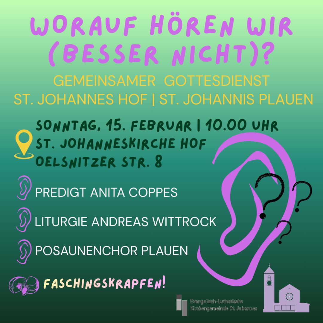 Gemeindereferentin Anita Coppes (St. Johannes) und Pfarrer Andreas Wittkopf (St.Johannis) gestalten gemeinsam den Gottesdienst am Sonntag Estomihi, 15. Februar 2026 um 10.00 Uhr in der St. Johanneskirche Hof